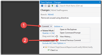Then let us do another change, and go to the Changes to commit the change, but this time using the Amend Previous Change, add a new comment too. In our example we do a change in the Class1.cs file.