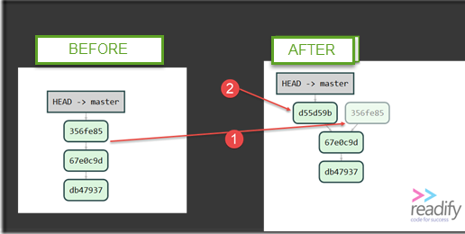 (The commit that was “overwritten” , 356fe85 in the image above – will only be there for a while, we say it is dangling, and after a while the git garbage collection will remove it. )
