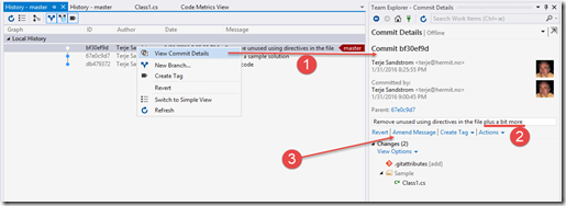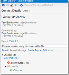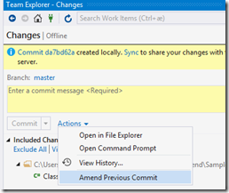 This post is written for those going from TFS Version Control to Git, and is an introduction to a smart improvement in Visual Studio 2015 - Commit Amend. Command Line enthusiasts already know how this is done, but it may still be useful to see how this is resolved in Visual Studio.