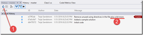 What happened was that the earlier commit is still there (1), but a new commit with both changes was added, and the HEAD and master now points to the new one (2). So the history view from VIsual Studio is correct, it shows the history from master/head and backwards. In Git terms this is what is called “the history has been rewritten” (and there are more commands that can do this)