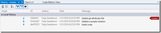Notice that both the .gitattributes and the Class1.cs is included, so it is obvious the first commit has been expanded with the new one. Also notice that the SHA-key has changed, so there is in fact a complete new commit. If we use tool like GitViz this is even easier to see: