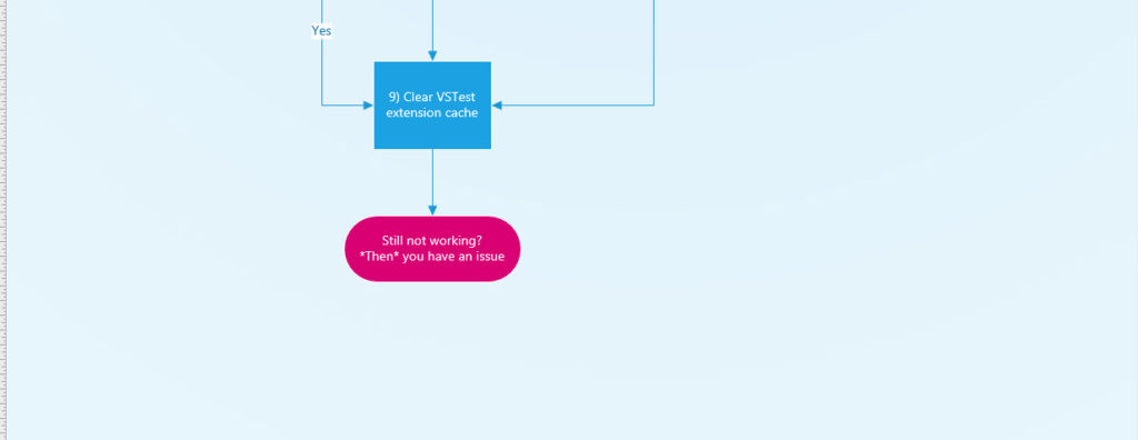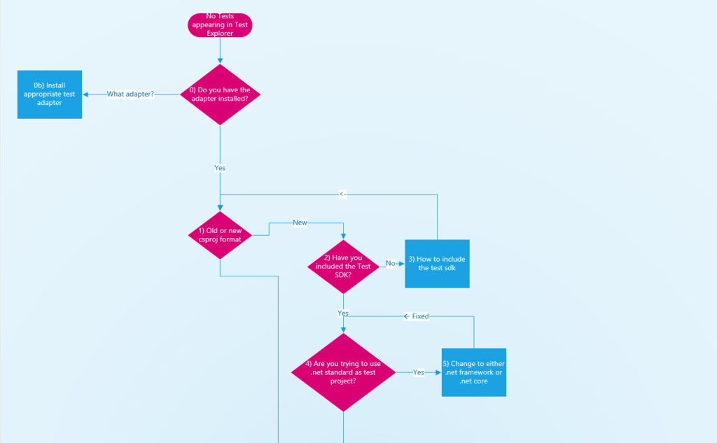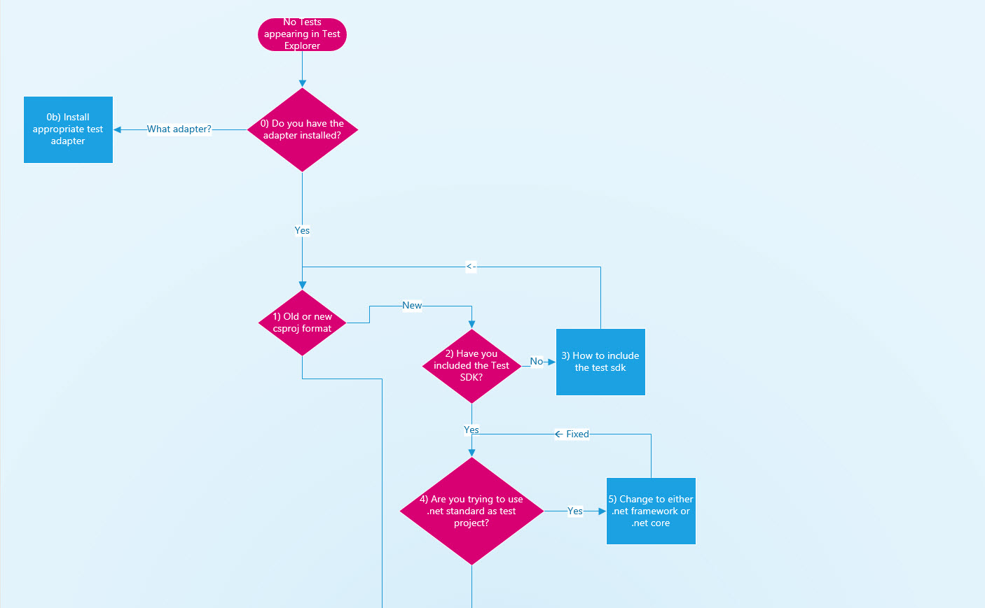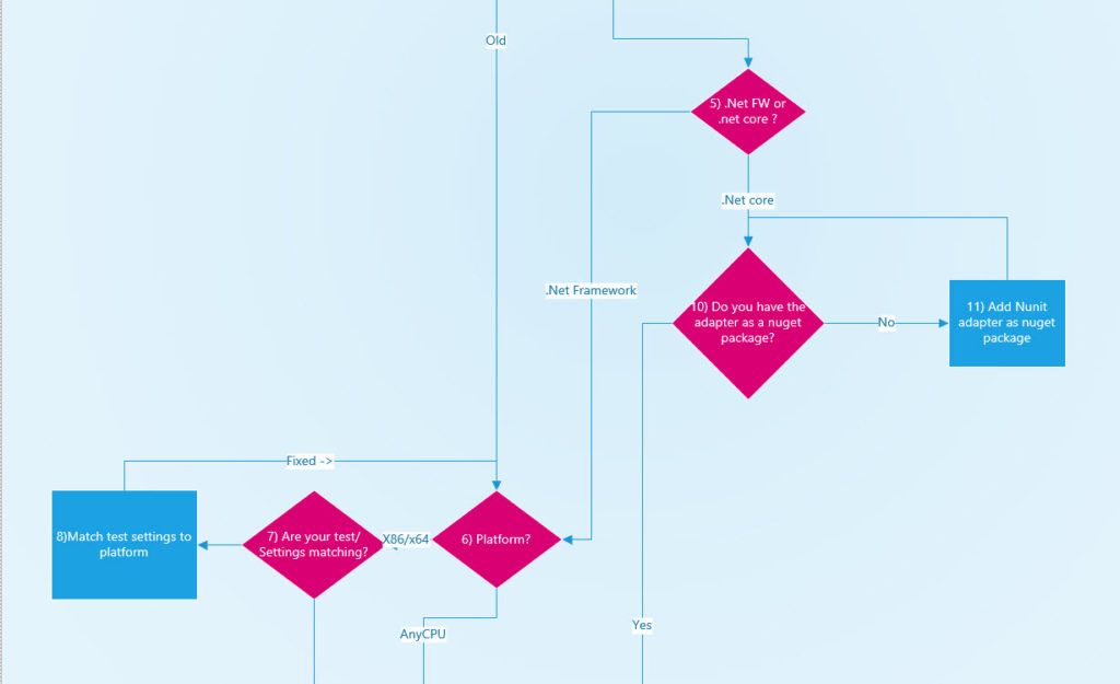 The different variations of targets and adapters doesn’t make this easier. To help in diagnosing this, I have created the diagnostic flow chart shown below. Further below you will find the comments for each block and how to rectify the issues, if you don’t already know. The flowchart is mostly general, although I use NUnit as the default adapter in the examples.