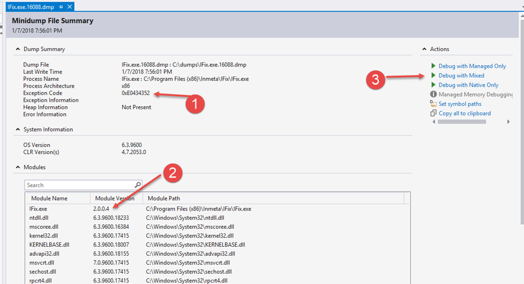 Just from this information I can get an idea of what is happening. I see an exception code (1), which if I google it, points to me – in this case – just to an “unknown” exception. I can check the version that is crashing (2), and also see what modules is loaded – and check if that makes sense.