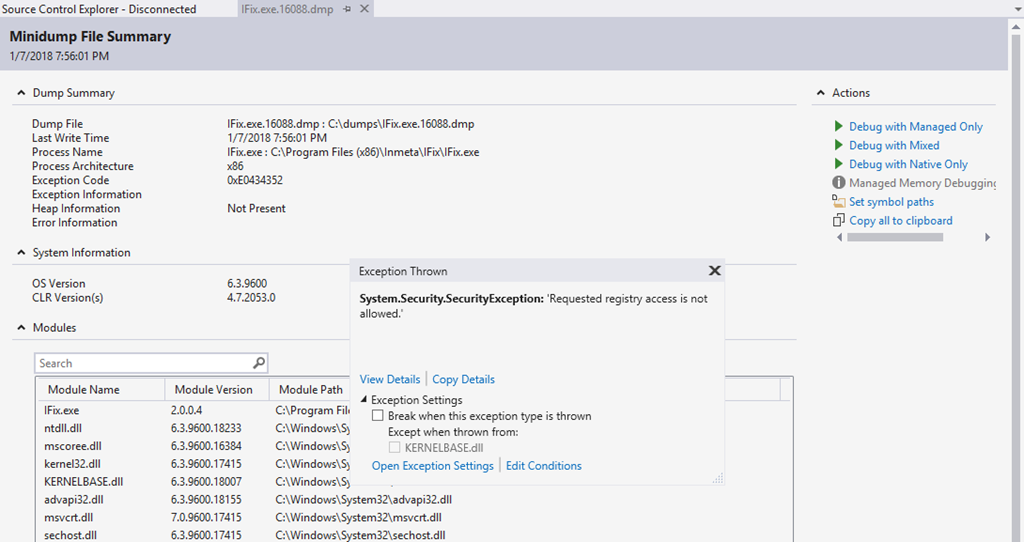 However, if you have the source code, and want to drill down using that, you can add that to the debugger, see this for all information on that. One thing to be aware of is that you must have a 100% match between the code that crashes and the source/symbols that are to be loaded. If you don’t have that, it will not accept the symbols.