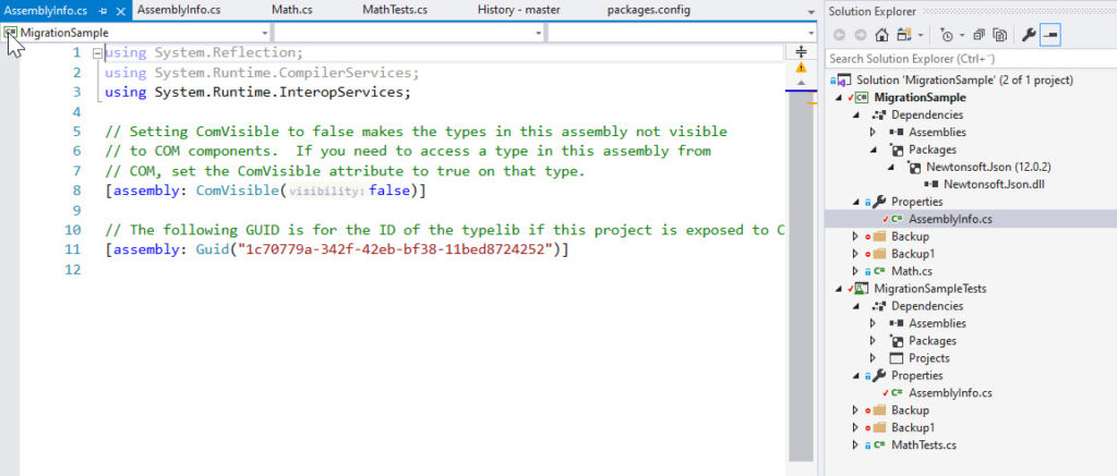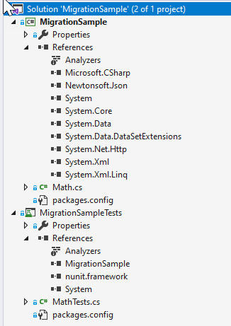 The math library use a nuget package, NewtonSoft.Json. The test project uses the packages NUnit and the NUnit3TestAdapter. Both are installed using the legacy nuget package format (!). The new SDK style csproj only supports the new packagereference style package formats, which is very good, but we need to have these converted too.