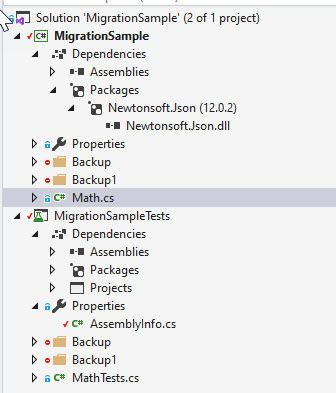 After reloading, the project looks like below, and we see we still have the package there, but now it will be as a package reference. We also see the Backup folders - although they are ignored by git (note the icon).