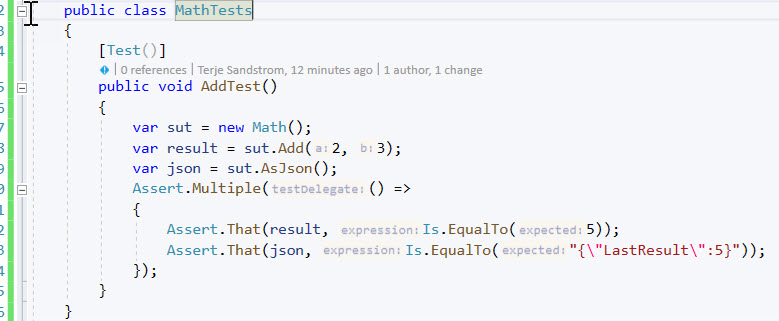 The code below is the unit test for the Math class, where we test two aspects of the Add method.