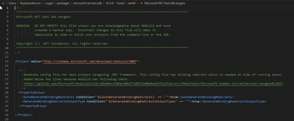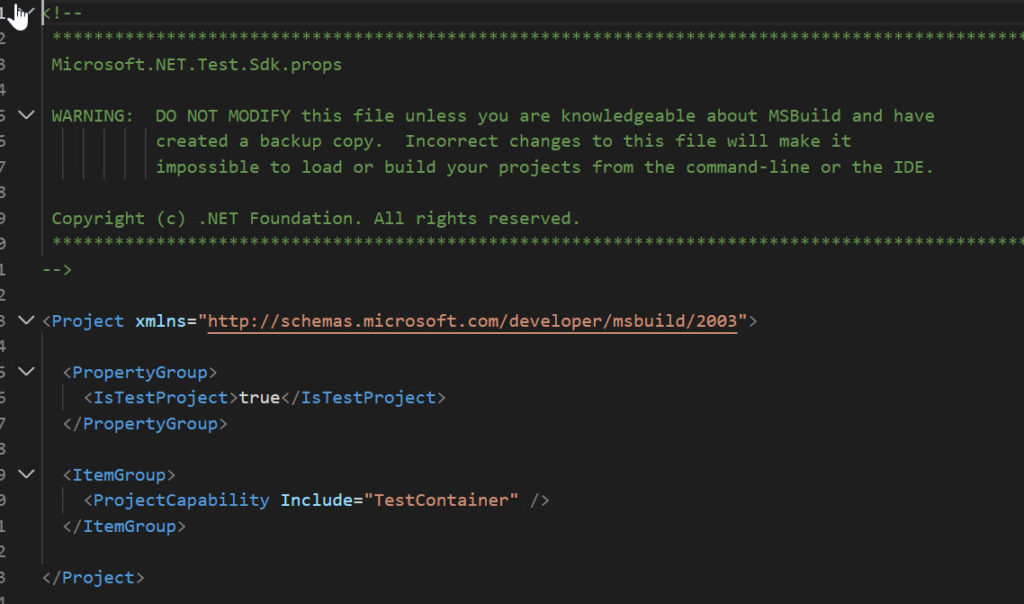 The test.sdk package contains only a few properties. We removed the properties for test above (point 4 above), and as can be seen the props file contain a property IsTestProject = true, so by including that package we ensure we have the right default properties for a Test project