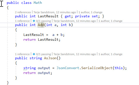 The Math class is has only two methods, Add, and AsJson, the latter just returns a json representation of the last result of the Add method.