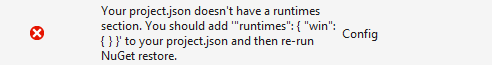 When moving between old and new csproj formats, and back again when it doesn’t work, I have several times ended with a project.json error looking like this: